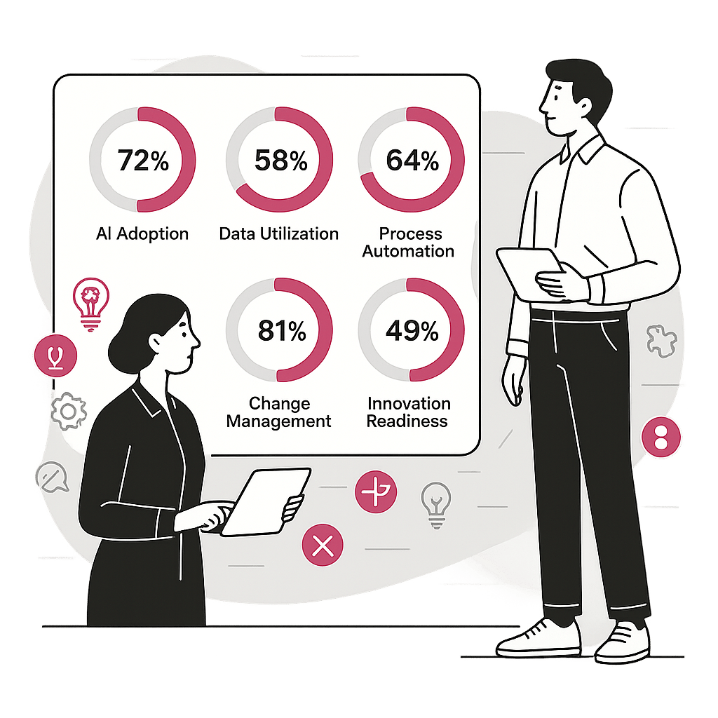 In under 3 minutes, you'll get a personalised score across five key categories: AI Adoption, Data Utilisation, Process Automation, Change Management, and Innovation Readiness.